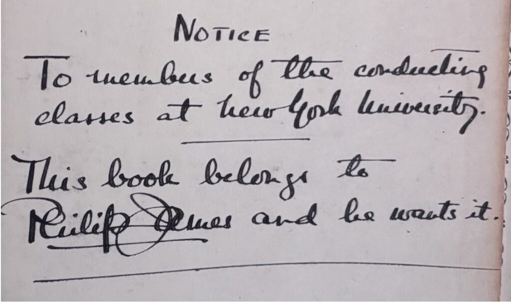Albert was an excellent musician. He was the very first head of the NYU music department, back in the twenties. Philip became, at his behest, part of NYU, and Stoessel also hired the somewhat ‘avant-garde’ composer Marion Bauer. And Stoessel wrote a book on conducting called The Technic of the Baton: ‘This book belongs to Philip James and he wants it.’
