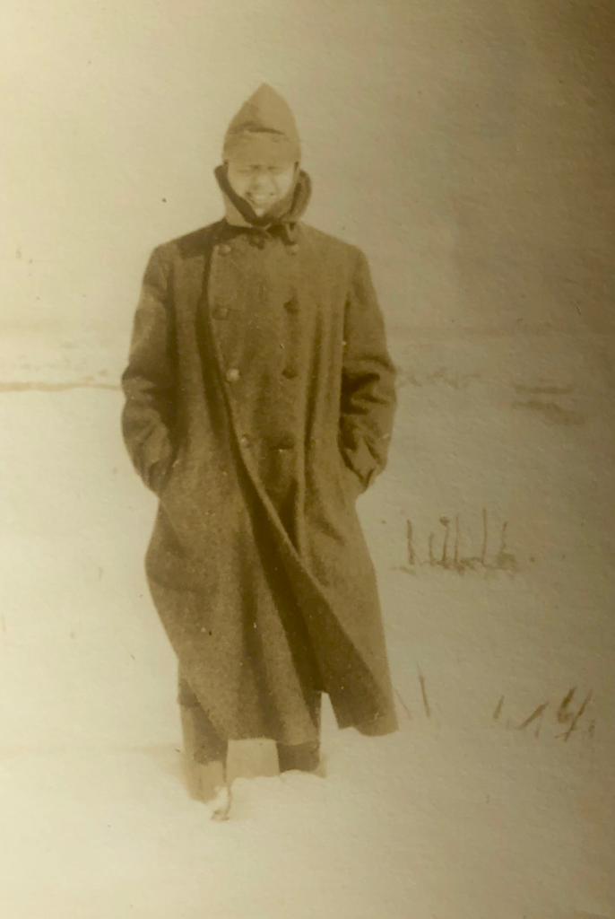 April 10, 1918: To-day marks the closing of my first six months in the Army. Quite rough, cold and penetrating. We were nearly frozen. About 50% of the boat are sea sick. I have felt very well although at time a grinding spell comes over me due to the awful conditions of our sleeping quarters. Men packed like sardines on the deck… some of them vomiting all about..