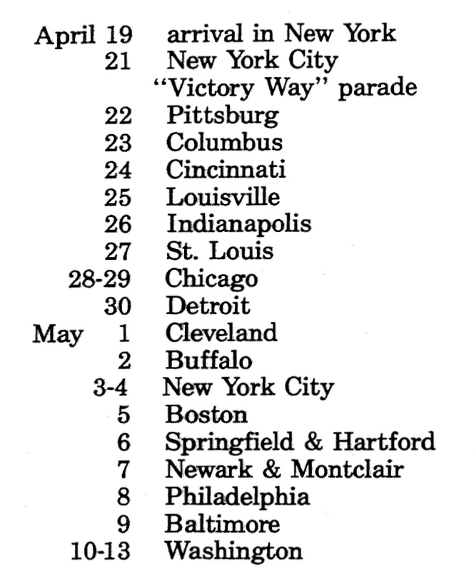 April 22 – 1919 – Pittsburgh, PA. In the morning we had a parade and after a concert in the afternoon we had a swim in the big town Natatorium. In Pittsburgh the Chamber of Commerce gave me a room to rent in and dress and they also placed at my disposal a fine Locomobile car with flying flags. I am sure the citizens thought I was old Black Jack Pershing himself!
