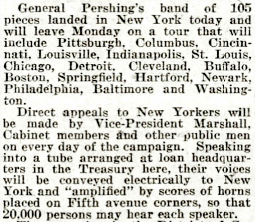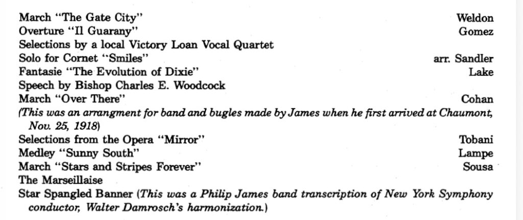 In April 1919 Philip James returned to the United States as conductor and commanding officer of the Allied Expeditionary Headquarters Band, now known as ‘General Pershing’s Band.’ He led the band on a nineteen-city Victory Loan tour… James’s concerts were wildly received as emblematic of America’s contribution to final victory in the Great War.