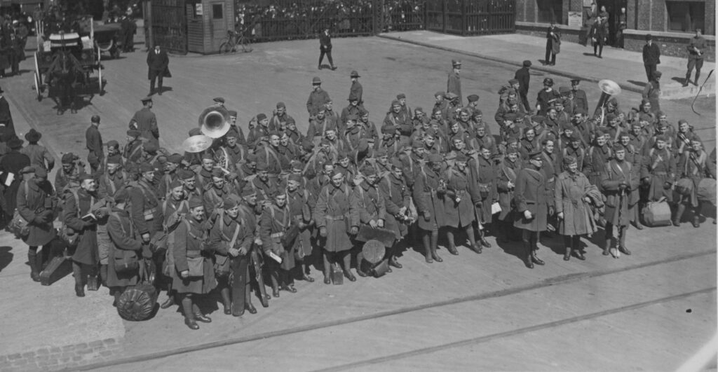 We arrived at the Hotel Statler, Cleveland in the morning. After I cleaned up I started to go to the Armory to arrange for the concerts, as Captain Fisher has left us to go to Washington DC where we shall meet him later. However in leaving the hotel in the AM a pot of flowers was thrown at me from above. The pot just missed me but I was covered with dirt. I was hissed by persons on the streets and one woman stopped me and asked if I knew why we fought Germany. ‘President Wilson had better get back to the US or we will have a red flag on the White House.’ In the afternoon things got worse and the town was placed under the protection of the State Militia. Tanks were used in the streets and I actually saw one woman ground to pieces by a tank. In the midst of the rioting I received an order from the Commanding General of the area to give up the concerts and leave town at once which we did under the protection of the Militia, so we got on our train and started east.