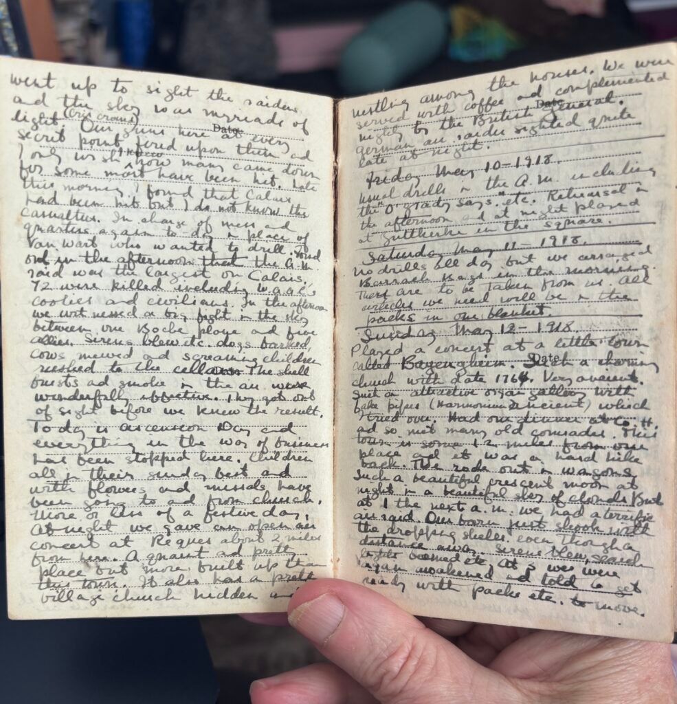 Here is just SOME of his diary, when the War was gradually over. The AEF is the infantry, the American Expeditionary Force; the YMCA, or ‘Yhuts,’ provided a place for much of the music. It’s FASCINATING!